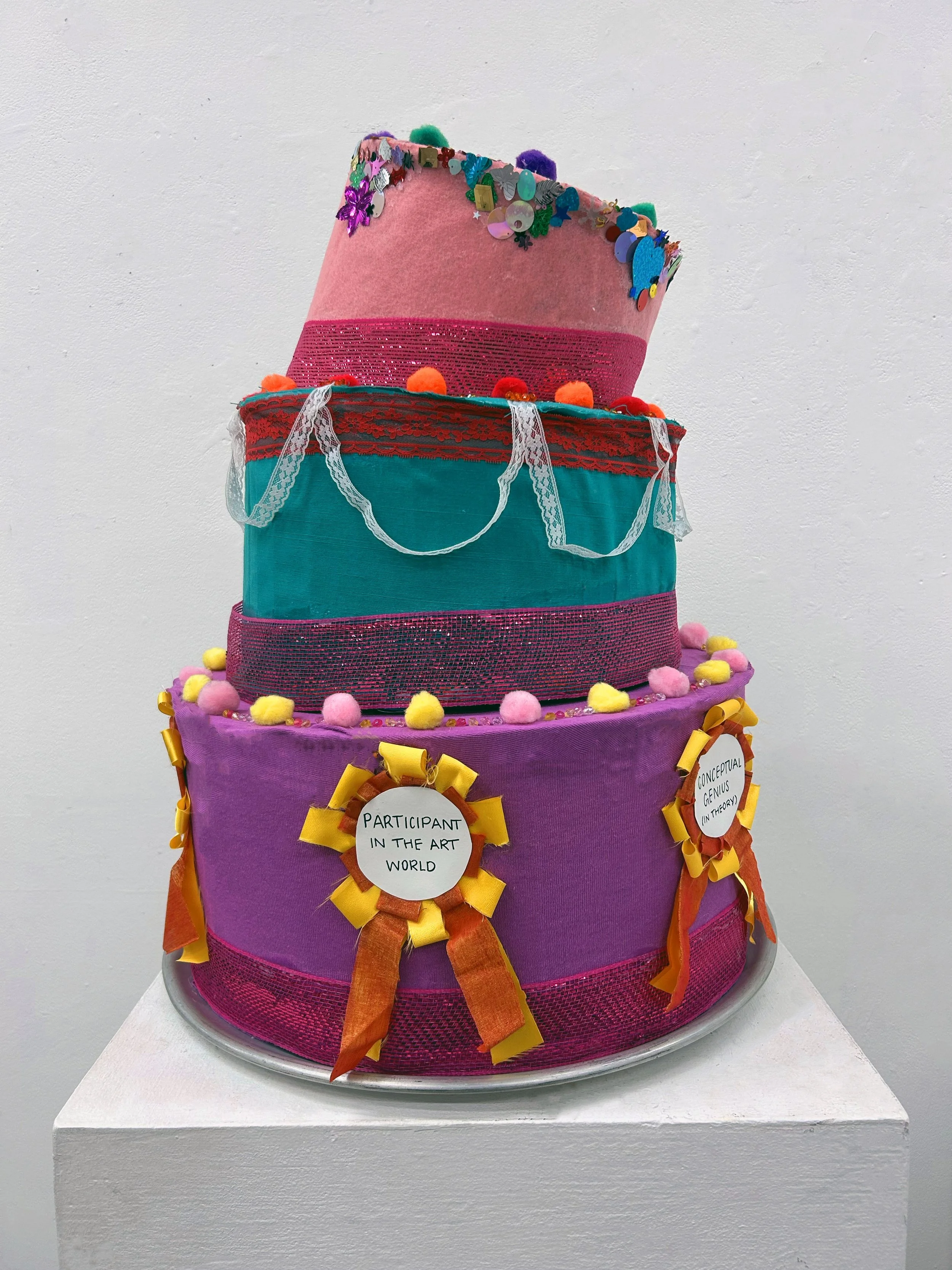 Congratulations, I Guess is an absurdly oversized, fabric and found-object sculpture of a cake—a towering, decorative monument to artistic achievement that is both indulgent and insincere. Adorned with sarcastic award ribbons and excessive, imperfect decorations, the piece embodies the tension between recognition and disillusionment, success and spectacle.