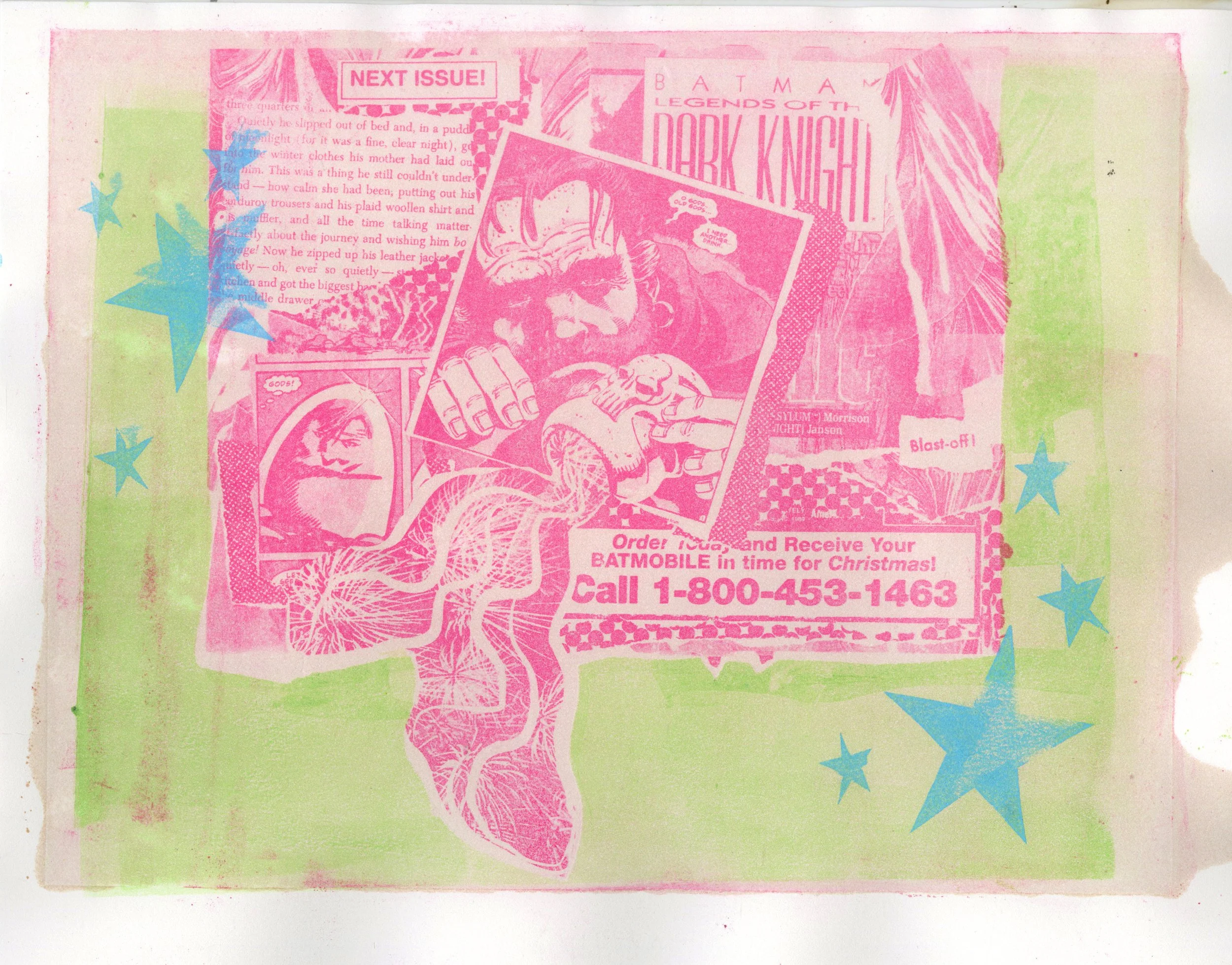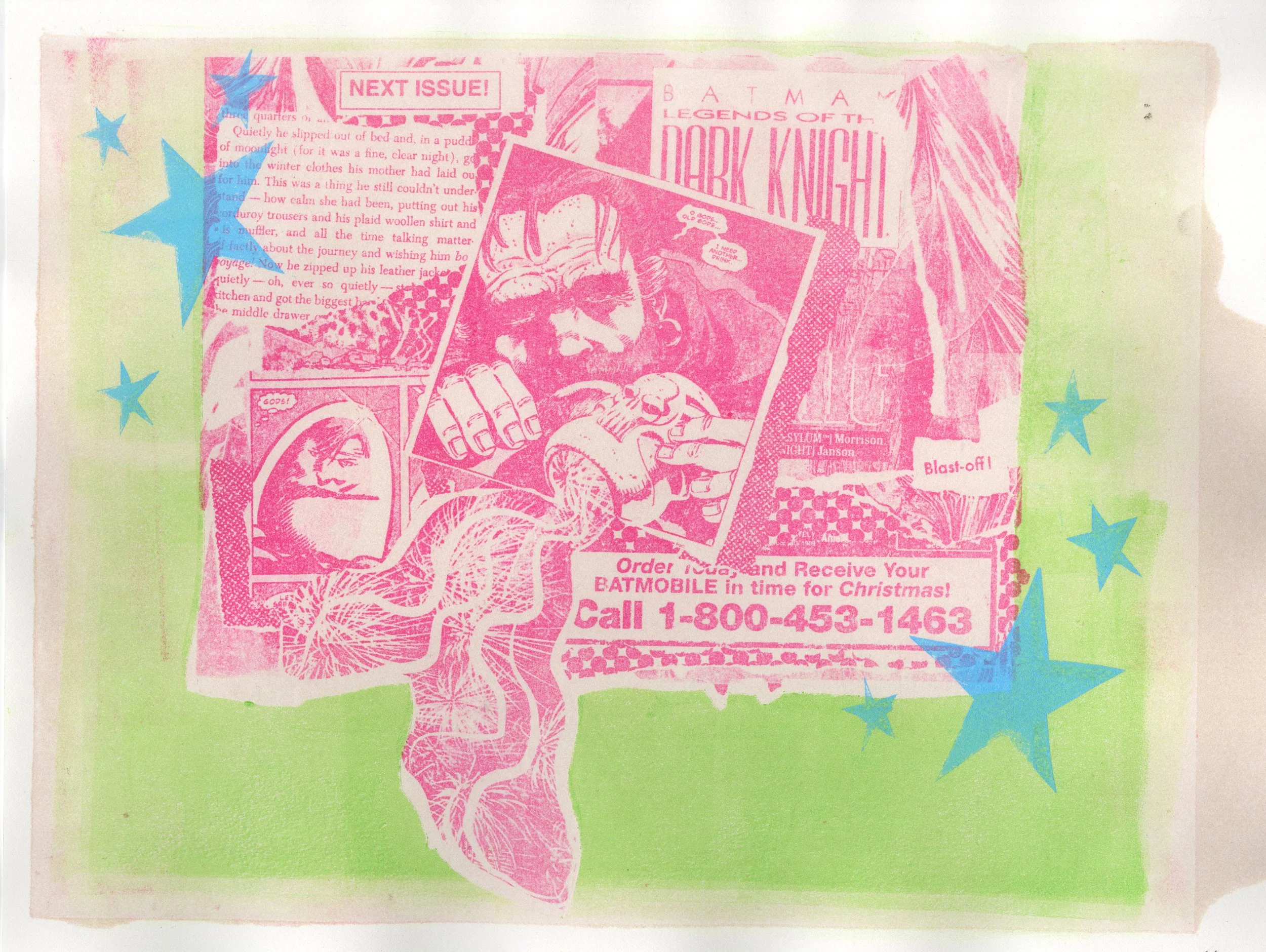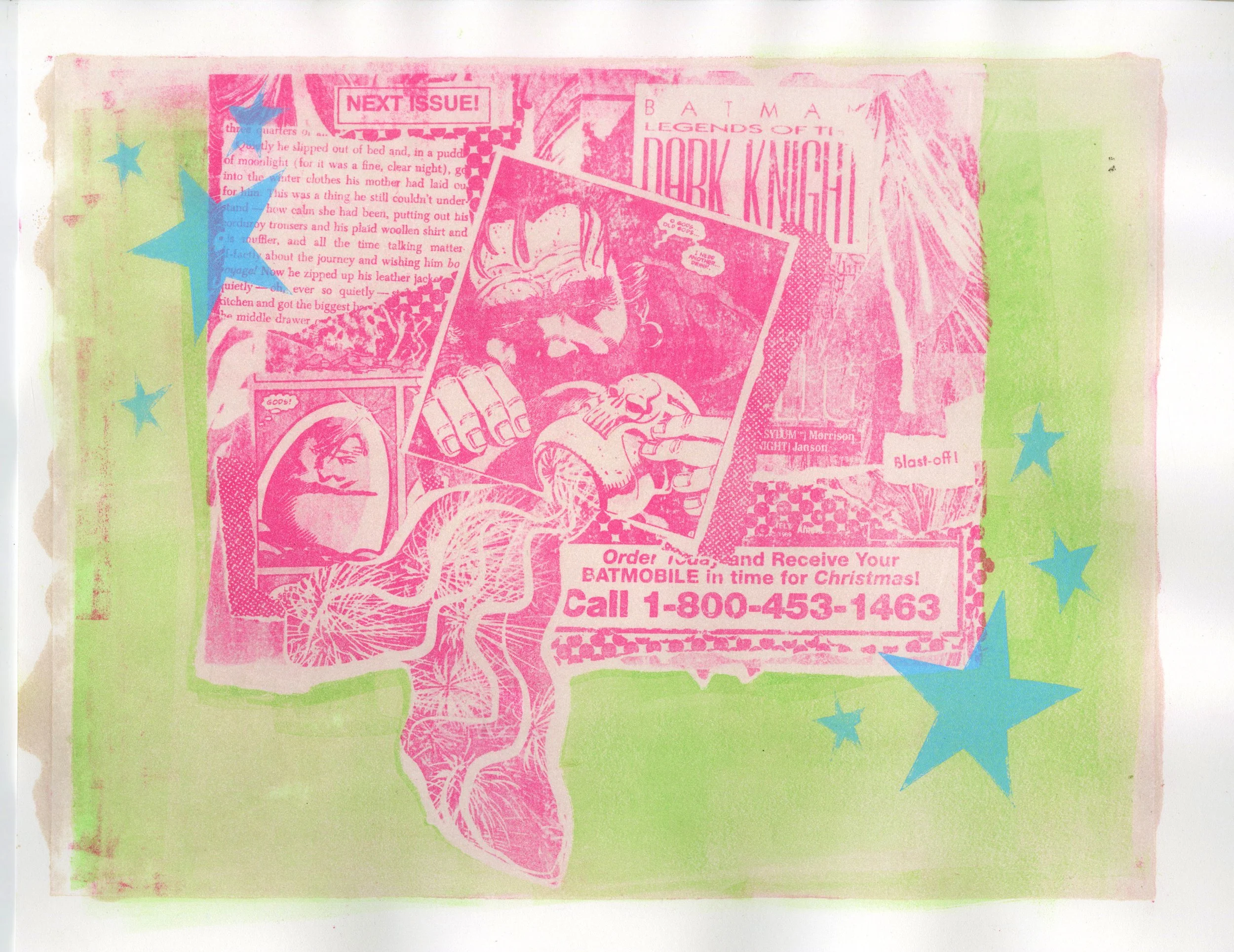 Batmobile Monotype and Paper Lithography of Collaged Comic Books on Stonehenge Paper Year: 2025 Dimensions: 11 in x 14 in