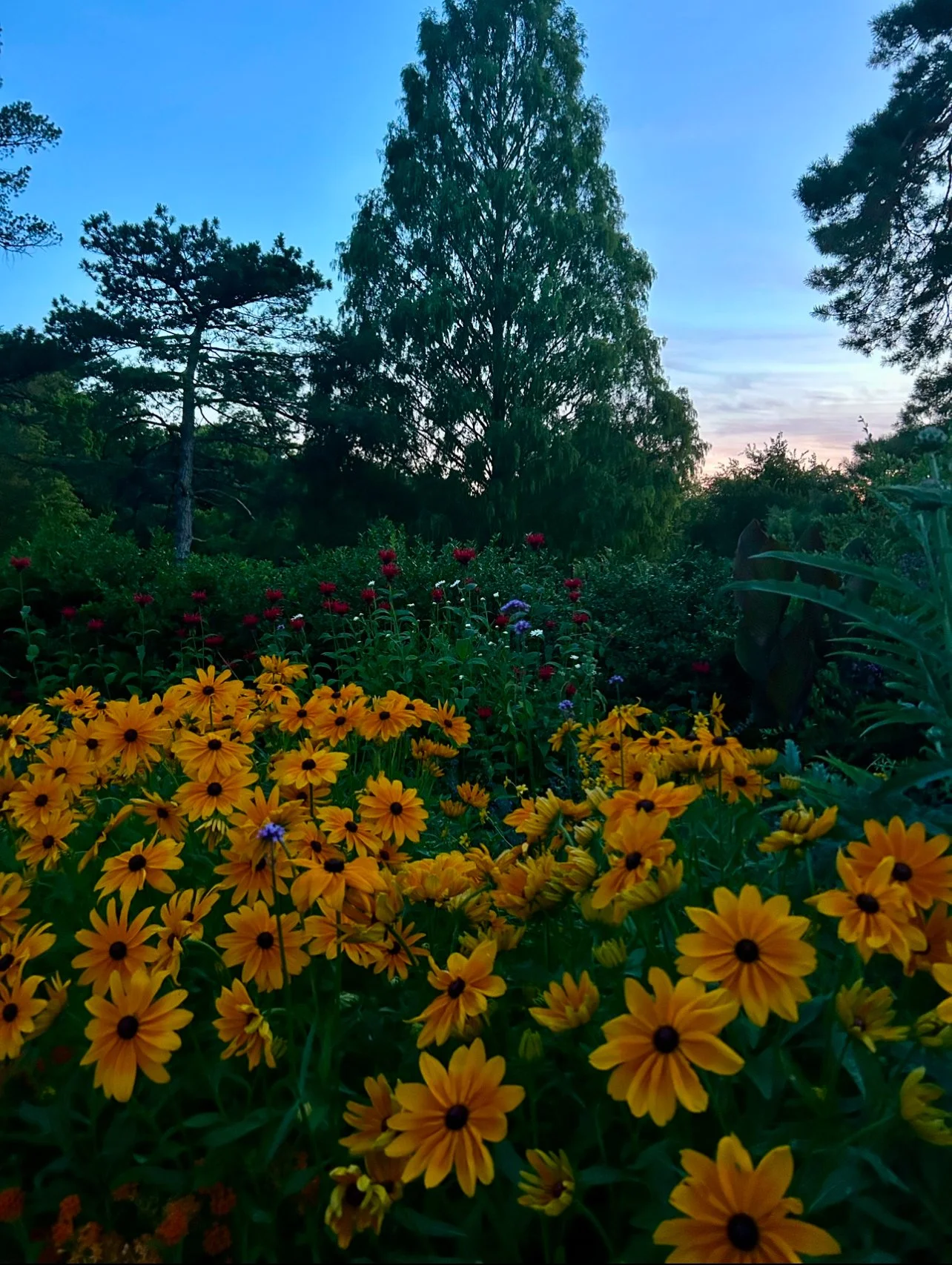 This photograph, taken at Ault Park in Cincinnati during the summer of 2024, captures a moment of transition between day and night. The vivid yellow flowers in the foreground contrast against the deepening blues of the sky, while the trees frame the scene with a sense of quiet balance. Serving both as a personal record of place and as source material for later printmaking, the image reflects the fleeting quality of natural light and seasonal growth.